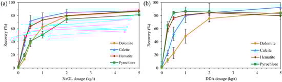 Microflotation results of model minerals with collectors only at pH 7 are shown in Figure 1. For both NaOL and DDA, the recoveries of minerals followed a similar trend in that they gradually increased with respect to the collector dosage; relatively high recoveries (between 70 and 80%) could be achieved with 2 kg/t of collector for all four minerals. As the collector’s dosage further increased to 5 kg/t, their recoveries did not increase significantly. The high recoveries and similar recovery trends of all minerals confirm that both collectors are strong but with poor selectivity, which highlights the importance of depressants when these collectors are used in Nb mineral flotation.