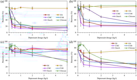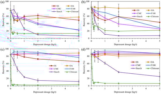 Microflotation results of model minerals in the presence of depressants and 2 kg/t of DDA as collector are shown in Figure 3. During the test, it was noticed that chitosan acts more effectively (i.e., the recovery of minerals already reduced to minimum with 250 g/t chitosan) than when NaOL was used as collector. Due to this reason, chitosan was evaluated at 25, 50, 100, 150, and 200 g/t in addition to the higher dosages.