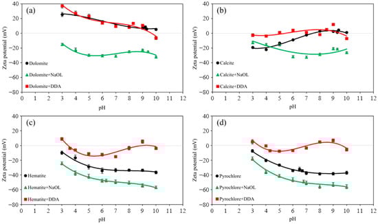 Figure 4. Zeta potential of (a) dolomite, (b) calcite, (c) hematite, and (d) pyrochlore in the presence of collectors, error bars denote 95% C.I.
