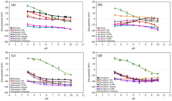 For pyrochlore, as seen in Figure 5d, its zeta potential did not significantly shift across the tested pH range in the presence of SS. This could imply that there is no adsorption; however, it is also plausible that adsorption took place, but due to the similar charges carried by the mineral and SS species, shifts in zeta potential could not be observed. Since SS has been applied as a pyrochlore depressant (as reviewed in the Introduction), it is expected that SS interacts with pyrochlore; the adsorption and mechanism therefore must be confirmed by other techniques such as XPS. The shift in zeta potential of pyrochlore with OA varied under different pH ranges: at pH > 6, a positive shift was observed; at pH < 6, its zeta potential shifted to the negative direction. This might be attributed to the adsorption of negatively charged oxalate groups, possibly on the Ca sites by forming calcium oxalate [41]. With the presence of F100, shifts to the negative direction could be observed at pH < 9. This could be attributed to the adsorption of negatively charged lignosulphonate species, and the adsorption mechanism is likely due to chemisorption, since a negatively charged pyrochlore surface would naturally repel negatively charged depressant molecules and inhibit physisorption. In the presence of starch, the zeta potential of pyrochlore did not observe significant shifts across the tested pH range; similar to the case of pyrochlore with SS, this could imply no adsorption; it is also possible that similar charges carried by the mineral and starch molecules would allow the zeta potential to remain almost identical after adsorption takes place. Since starch has been applied as a pyrochlore depressant (as reviewed in the Introduction), it is expected that starch could interact with pyrochlore; the interactions should be further investigated by other surface chemistry techniques. In the presence of CMC, shifts to the negative direction could be observed at pH < 9. This could be attributed to the adsorption of depressants, and the adsorption mechanism is likely due to chemisorption, since a negatively charged pyrochlore surface would naturally repel negatively charged depressant species and inhibit physisorption. Similarly to dolomite, calcite, and hematite, a substantial shift to the positive direction was observed over the entire pH range when chitosan was added, and as a result, the IEP of pyrochlore shifted from 2.5 to 8. The adsorption mechanism could not be confirmed by zeta potential alone due to similar reasons explained above.