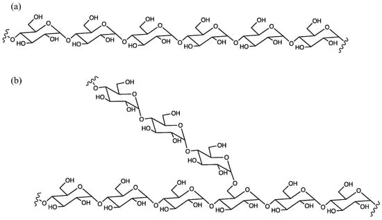 Figure 7. Structure of (a) amylose and (b) amylopectin starches, adapted from [82].