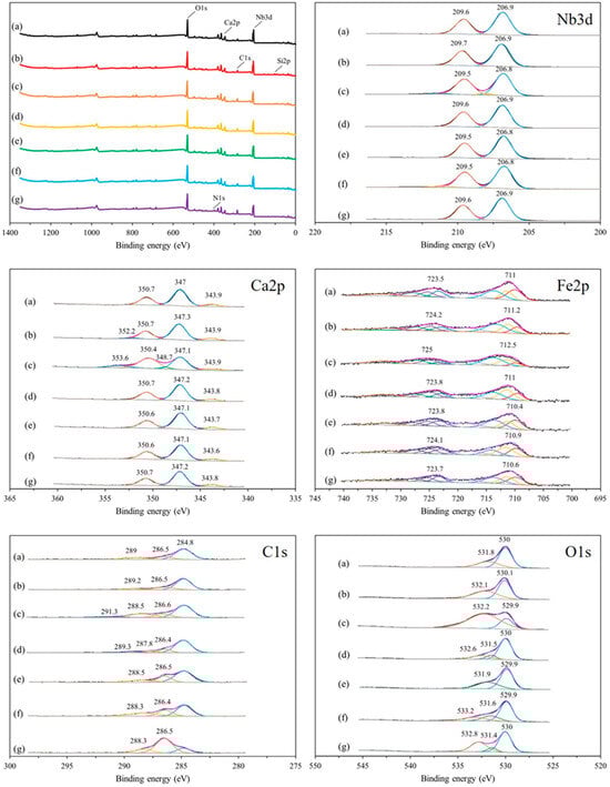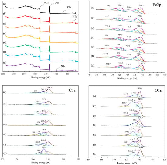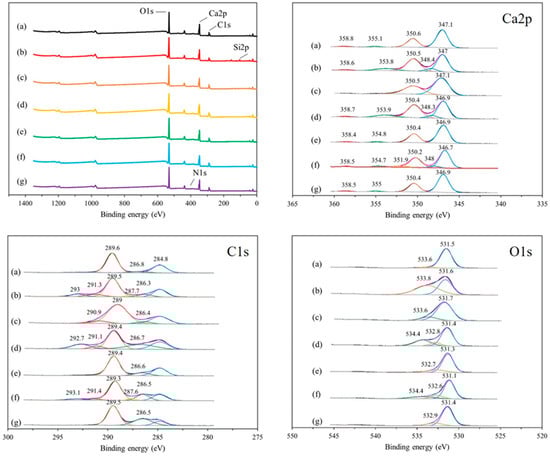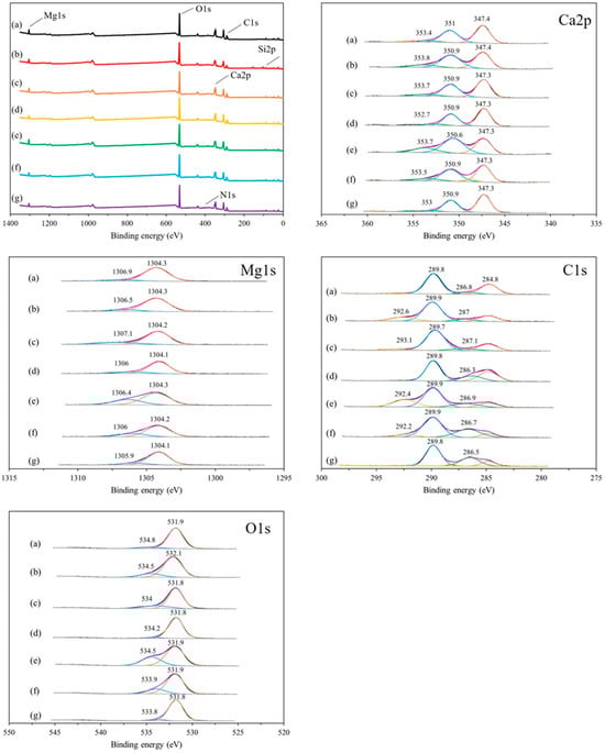 Figure 10. The survey and high-resolution XPS survey spectra of (a) dolomite and dolomite treated with (b) SS, (c) OA, (d) F100, (e) starch, (f) CMC, and (g) chitosan at pH 7.