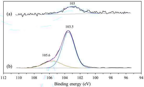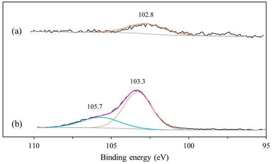 After conditioning with SS, as shown in Table 1, the content of Si on dolomite surface increased significantly from 0.9% to 6.7%, and the content of O increased from 46.2% to 50.6%; meanwhile, the contents of Mg, Ca, and C decreased slightly. In addition, Si2p peaks at 103.3 and 105.7 eV could be observed after SS treatment (Figure 11), suggesting the adsorption of SS species. This is in agreement with zeta potential measurement, where a shift to the negative direction was observed with SS (Figure 5a). This might explain the limited depression effect observed when DDA was used as collector (as shown in Figure 3a), since after adsorption, the negatively charged mineral surface might still naturally attract cationic amine species, whereas when NaOL was used as collector (Figure 2a), the negative surface charge would repel anionic oleate species and inhibit their adsorption on dolomite. It should be noted that a weak Si2p peak was observed at 102.8 eV on dolomite before SS treatment (as shown in Figure 11), which might be attributed to silicate impurities present in the model dolomite sample. As seen in Figure 10, the BE of Ca2p and Mg1s peaks did not shift significantly after SS treatment, suggesting their chemical environment did not change after treatment. A slight shift (+0.2 eV) was observed on the O1s peak corresponding to CO32−, suggesting its chemical environment was slightly altered after SS treatment. This might suggest the adsorption mechanism of SS (possibly in the form of silica gel Si(OH)4 at pH 7 [104]) on dolomite is through weak interactions such as hydrogen bonding [43] and electrostatic interaction [86]. The solubility of this gel in water is likely low, which explains the presence of Si on dolomite after washing.