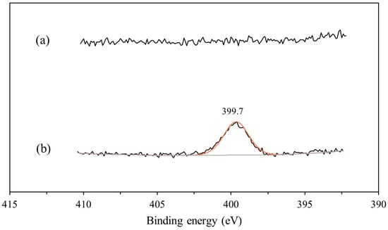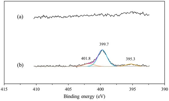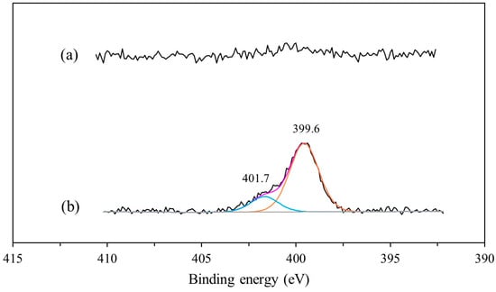 Figure 12. N1s spectra of (a) dolomite and (b) dolomite + chitosan at pH 7.