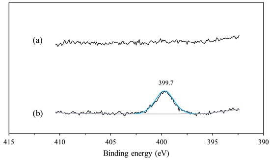 XPS analysis was performed using a Thermo Scientific Nexsa G2 spectrometer (Waltham, MA, USA) equipped with an Al Kα X-ray source (1489.6 eV). The spot size was 400 µm with 50.0 eV pass energy and 0.1 eV energy step size. A flood gun with low energy electrons was applied during data acquisition to avoid surface charging. The collected spectra were processed using Avantage software (Thermo Fisher Scientific, Waltham, MA, USA), and the binding energies (BE) were calibrated with respect to that of C1s for hydrocarbon (284.8 eV).