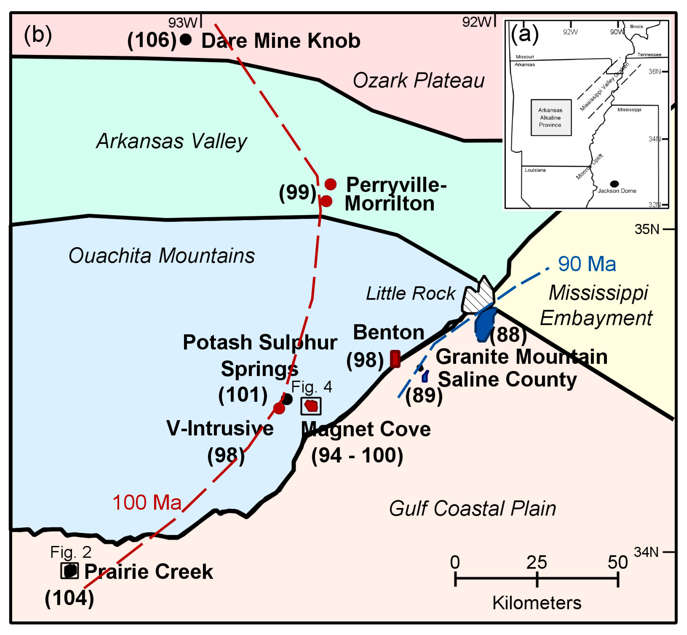- Eby, G.N.; Vasconcelos, P. Geochronology of the Arkansas Alkaline Province, Southeastern United States. J. Geol. 2009, 117, 615–626. [Google Scholar] [CrossRef]
