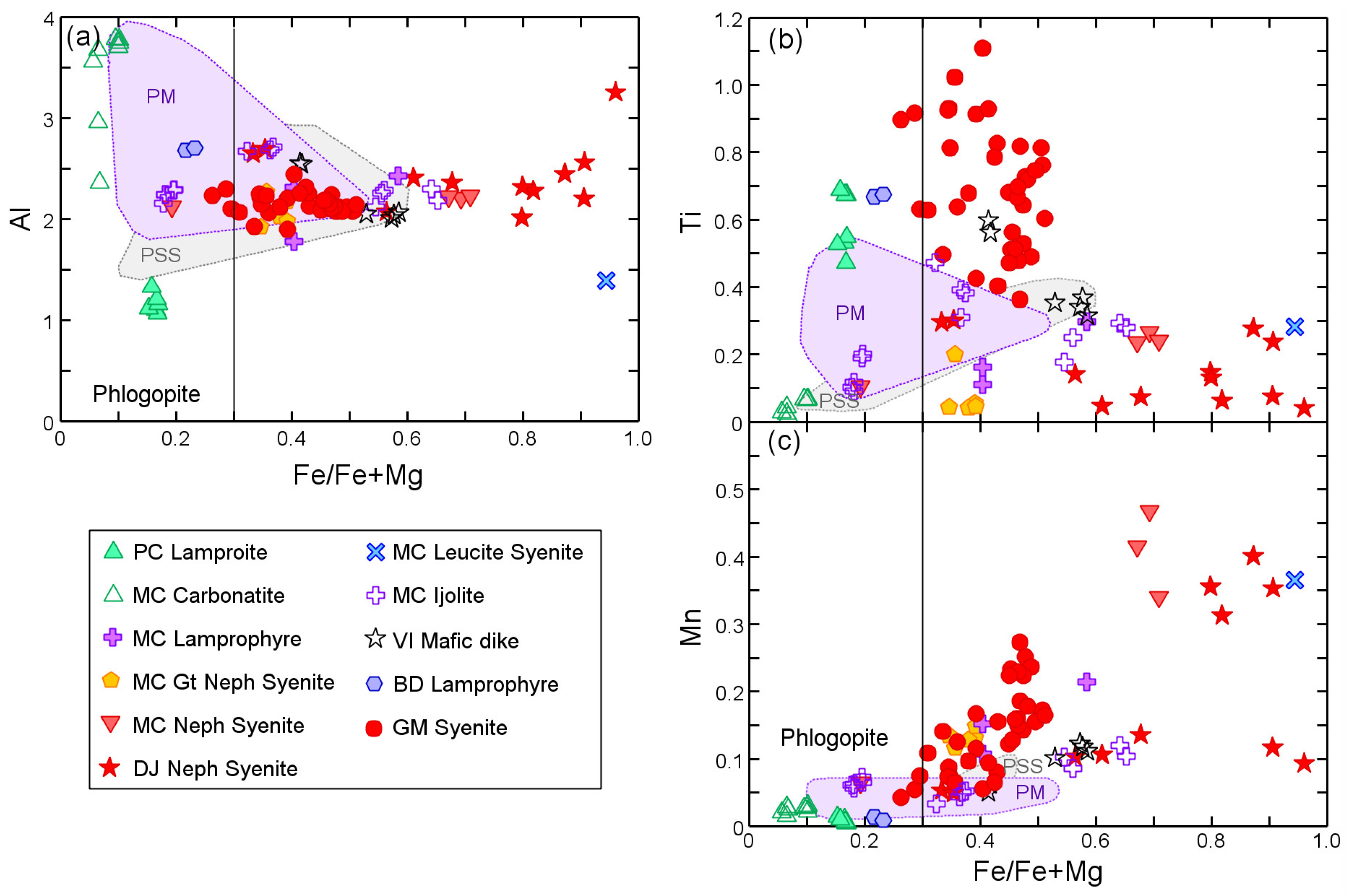 - Heathcote, R.C.; McCormick, G.R. Major-Cation Substitution in Phlogopite and Evolution of Carbonatite in the Potash Sulphur Springs Complex, Garland County, Arkansas. Am. Mineral. 1989, 74, 132–140. [Google Scholar]