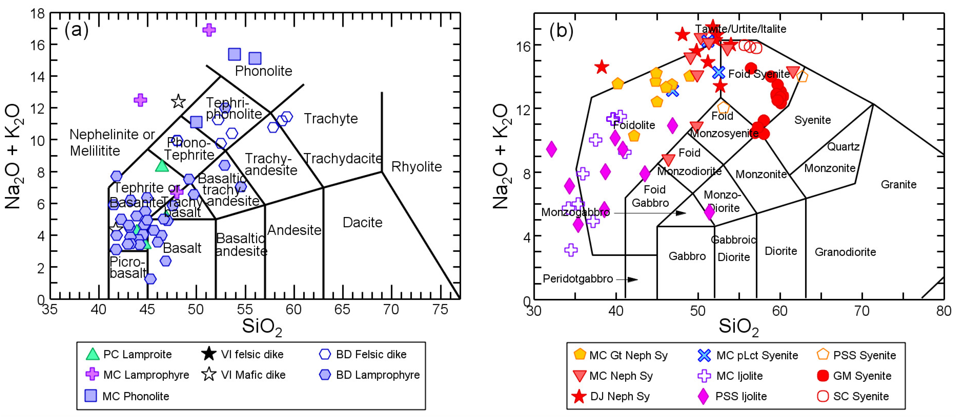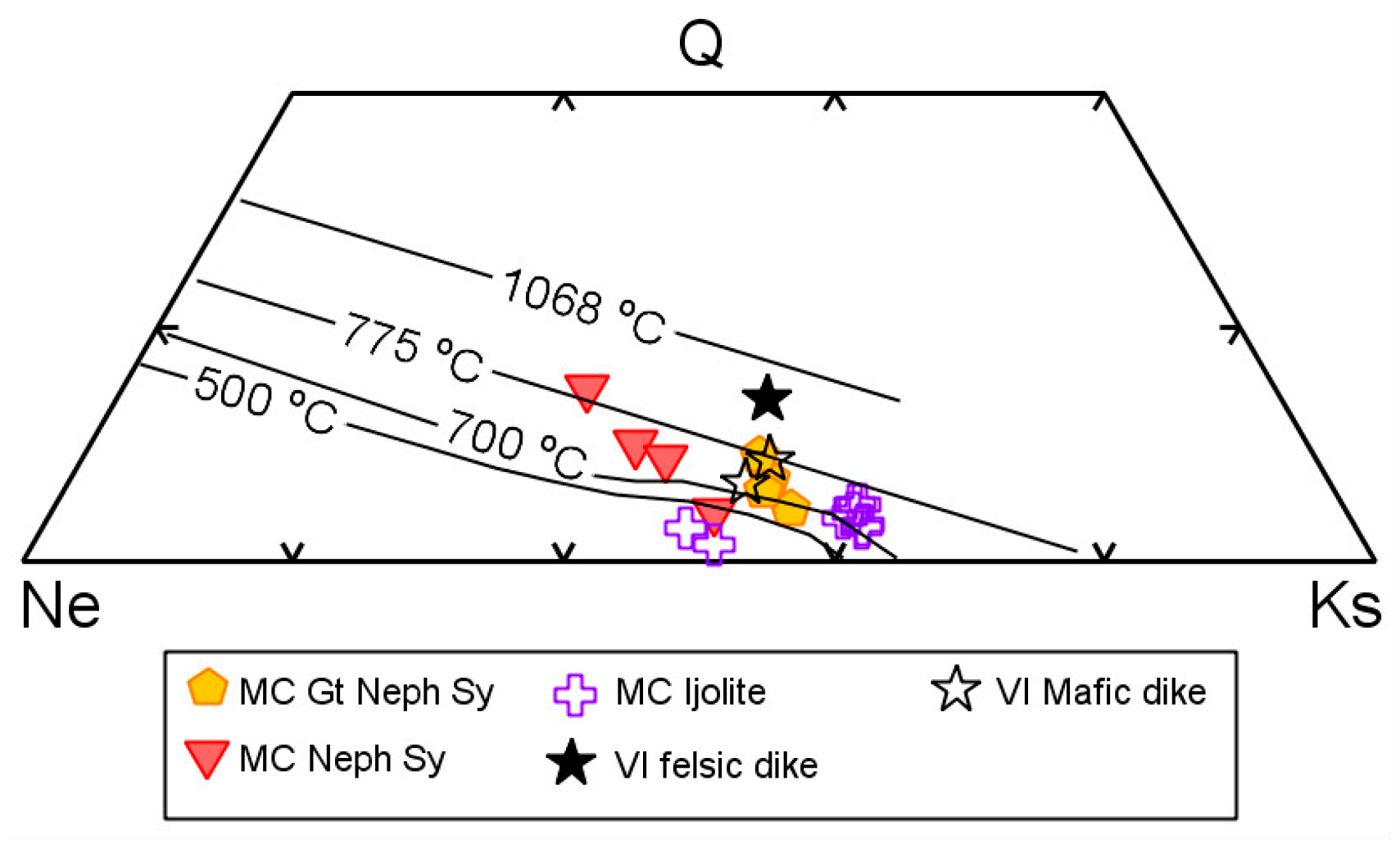 | Ijolite (MC) | 0.703695 ± 0.000193 | −10.9 ± 2.8 | 4.0 ± 0.1 |