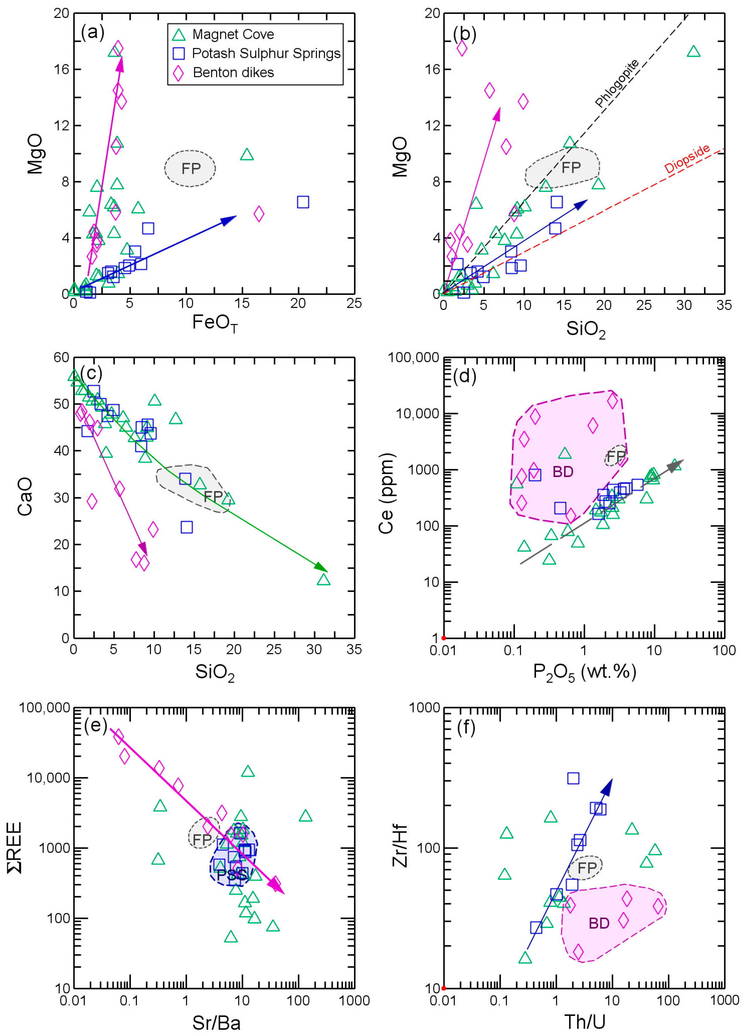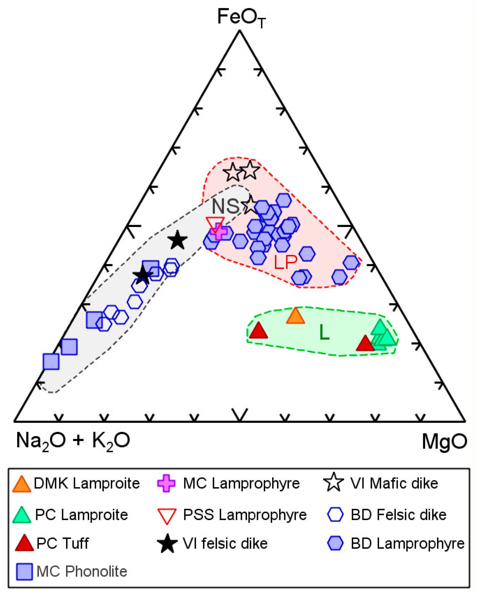 - Morris, E. The Cretaceous Arkansas Alkalic Province: A Summary of Petrology and Geochemistry. In Geological Society of America Special Paper 215; Morris, E.M., Pasteris, J.D., Eds.; Geological Society of America: Boulder, CO, USA, 1987; pp. 217–233. ISBN 9780813722153. [Google Scholar]