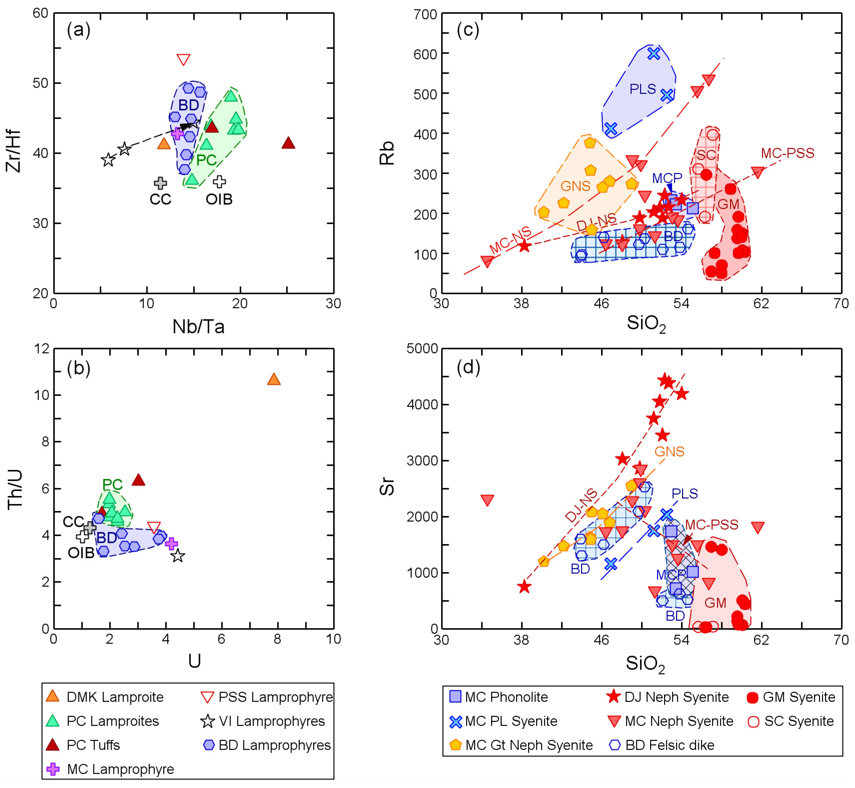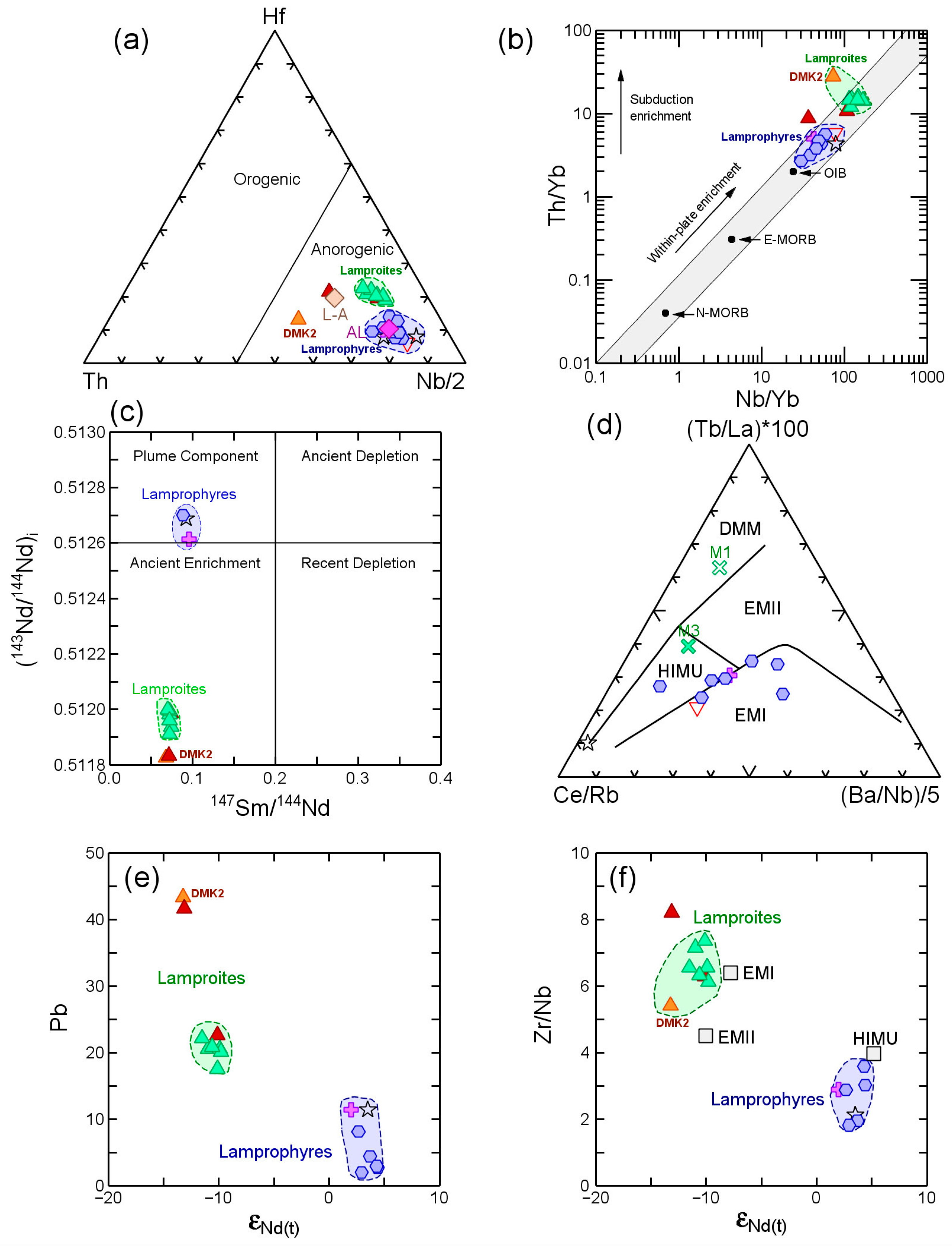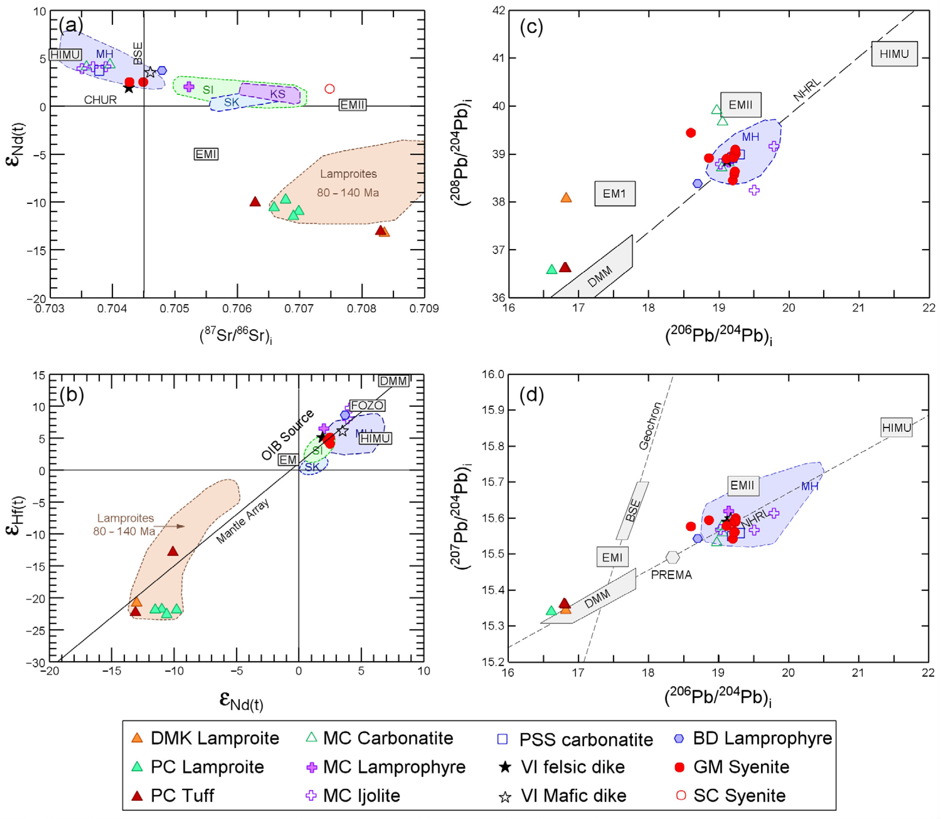 - Sarkar, S.; Dalton, H.; Giuliani, A.; Phillips, D.; Graham Pearson, D.; Nowell, G.M.; Woodhead, J.D.; Hergt, J.; Maas, R.; Lynton Jaques, A.; et al. Extreme Enriched-Mantle (EM) Compositions Recorded by the Sr-Nd-Hf Isotopes of Global Cratonic Lamproites. Geochim. Cosmochim. Acta 2025, 394, 220–243. [Google Scholar] [CrossRef]