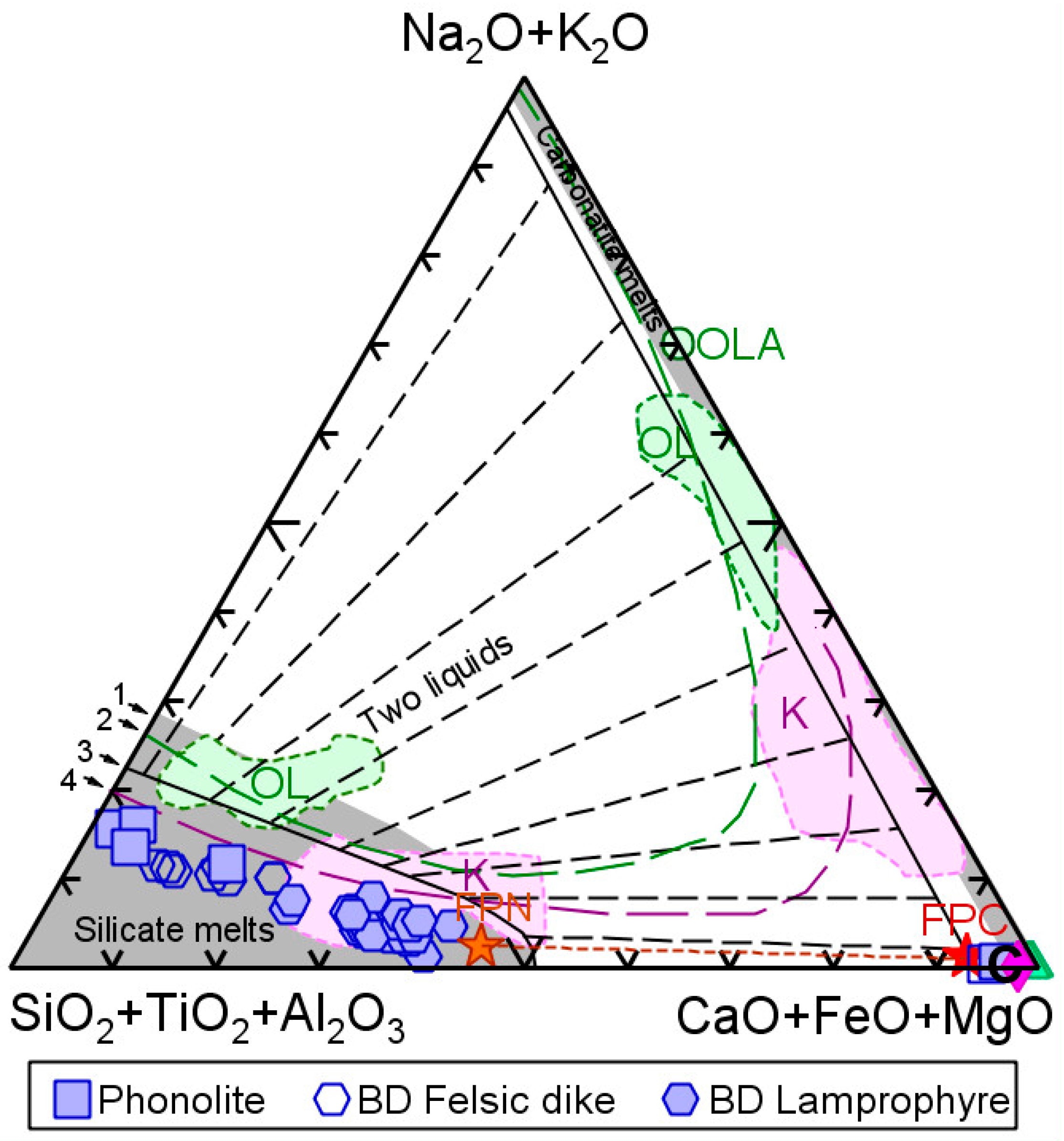 - Brooker, R.A.; Kjarsgaard, B.A. Silicate-Carbonate Liquid Immiscibility and Phase Relations in the System SiO2-Na2O-Al2O3-Cao-Co2 at 0·1-2·5 GPa with Applications to Carbonatite Genesis. J. Petrol. 2011, 52, 1281–1305. [Google Scholar] [CrossRef]