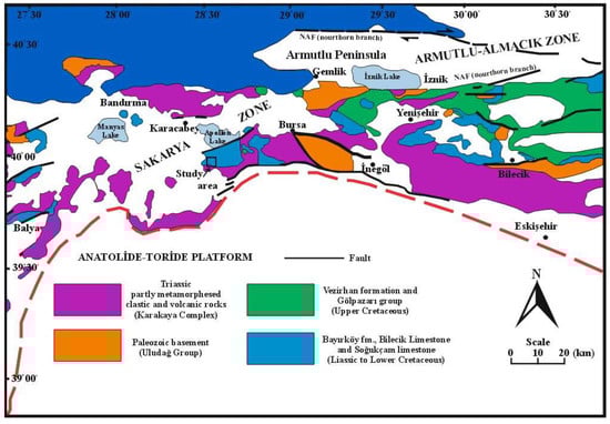 - Genç, S.C. Geology of the region between Uludağ and the İznik Lake. In Guide Book for the Field Excursion Along Western Anatolia; MTA Enstitüsü: Ankara, Turkey, 1986; pp. 19–25. [Google Scholar]