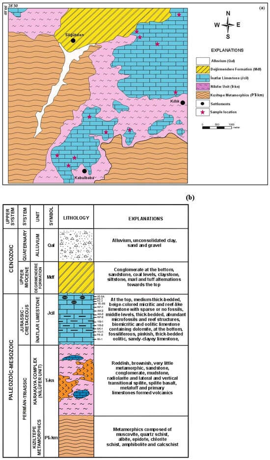 In the study area (Bursa Province, Sakarya Zone), the basement is formed by Permian–Triassic Kızıltepe Metamorphics (Uludağ Group), composed of phyllite, schist, gneiss, amphibolite, and calcschist, affected by greenschist facies metamorphism [44,56,79,80]. These are overlain by the Triassic Karakaya Complex (referred to as the Nilüfer Unit in this paper), which consists of weakly metamorphosed sandstones, mudstones, radiolarites, and spilitic volcanic rocks, along with black limestone blocks [56] (Figure 2a). These units are associated with the Karakaya Orogeny and represent key tectonic events [57,58]. Above this complex, the Inatlar limestone of the Bilecik Group is exposed north and northeast of Kabulbaba village (Figure 2a,b).