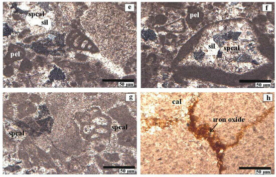 Polarizing microscope images of Inatlar limestone [48]. (a) Pellets in micritic limestone and sparry calcite veins filling the fractures; (b) Brecciated calcite and euhedral–subhedral dolomite crystals occurring within micritic limestone; (c) Euhedral dolomite crystals observed in the micritic limestone sample; (d) Stockwork-textured sparry calcite and fossil occurring within micrite; (e) Stockwork-textured sparry calcite, fossil shell fragments, and locally developed silicified stockwork veins within micrite; (f) Sparry calcite and silicification occurring within the micritic limestone; (g) Sparry calcite-textured limestone rich in fossil shell fragments; (h) Stylolitic structures occurring along fractures and cracks in the fossiliferous dark beige limestone. Abbreviations: sparcalcite (spcal), pellet (pel), dolomite (dol), calcite (cal), and silicification (sil).