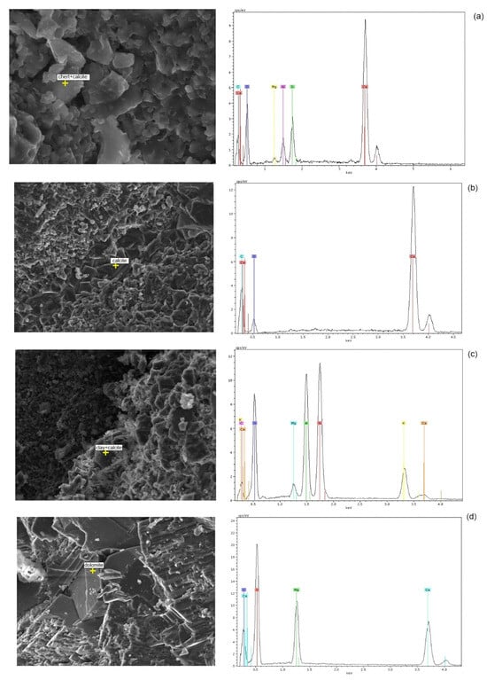 Scanning electron microscope images of Inatlar limestone samples, illustrating the distinct morphologies. (a) chert and calcite, (b) sparry calcite veins, (c,d) euhedral and subhedral calcite and dolomite crystals [48].