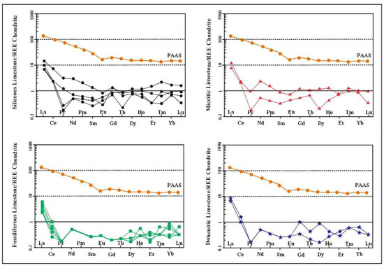 Chondrite-normalized rare earth element (REE) patterns [83] of the studied limestone samples, compared with PAAS (Post-Archean Australian Shale) [84].
