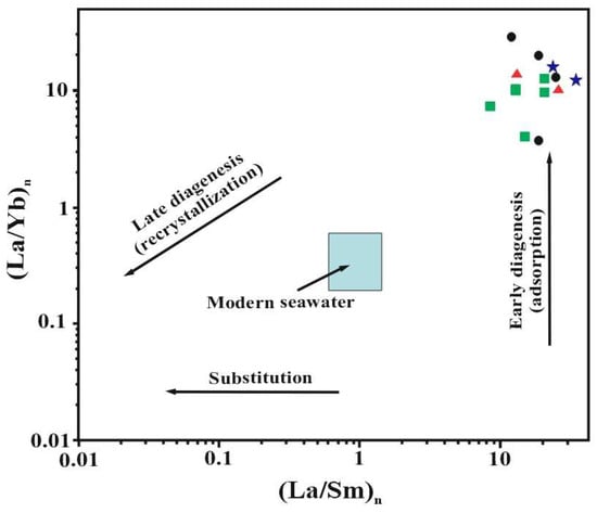 (La/Sm)n versus (La/Yb)n discrimination diagram for Inatlar limestone samples, illustrating REEs fractionation patterns and early diagenetic sorption processes [111].