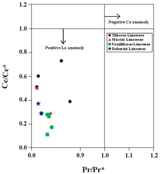 Ce/Ce* versus Pr/Pr* ratios diagram for Inatlar limestone samples, illustrating Ce and La anomalies and their geochemical significance [105].