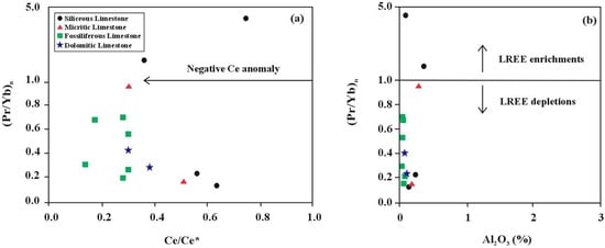 Plot of the examined limestone samples. (a) Pr/Ybn values according to Ce/Ce* ratios [115]. (b) Pr/Ybn values according to Al2O3 (weight%) content [116].