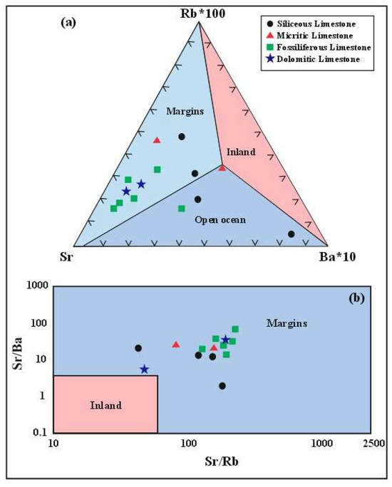 (a) Rb-Sr-Ba ternary diagram and (b) Sr/Ba versus Sr/Rb discrimination diagram of Inatlar limestone samples [115].