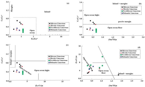 Environmental discrimination diagrams of Inatlar limestone samples, illustrating relationships among (a) Eu/Eu* versus Ce/Ce*; (b) (La/Ce)n versus Ce/Ce*; (c) (Sm/Yb)n versus Ce/Ce*; and (d) (La/Ce)n versus (Sm/Yb)n ratios [83].