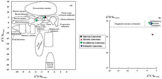 (a) Diagram showing various isotopic fields [118,119] of İnatlar limestones based on δ13C‰ (PDB) and δ18O‰ (PDB) values. (b) Diagram of carbon and oxygen isotopic compositions [120] of İnatlar limestone.