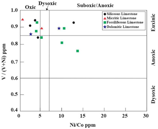 The Ni/Co and V/(V + Ni) ratios are widely recognized as consistent proxies for interpreting redox conditions [131]. The plot of V(V + Ni) versus Ni/Co values (Figure 15) indicates that the majority of the Inatlar limestone samples fall within oxic to suboxic/anoxic environments based on their V/(V + Ni) values, whereas Ni/Co ratios classify most samples, particularly fossiliferous limestones, as having been deposited under anoxic conditions. Similarly, the authors of [38] reported that Archaean carbonate sediments from the Tanwan Group rocks of the Bhilwara Supergroup of India were deposited in a suboxic environment.