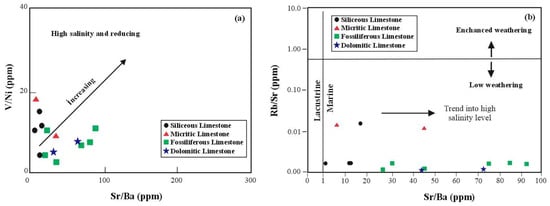 (a) Graph of Sr/Ba versus V/Ni ratios for Inatlar limestone samples [137]. (b) Graph of Rb/Sr versus Sr/Ba ratios [142,143].