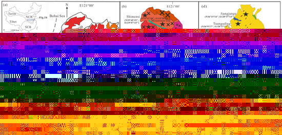- Zhang, Z.K.; Zhou, Y.Q.; Liang, W.D. Late Mesozoic magmatic evolution history in eastern Shandong. Geol. Rev. 2015, 61 (Suppl. S1), 778–779. [Google Scholar]