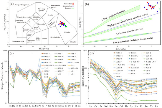 (a) TAS diagram after [41]; (b) K2O-SiO2 diagram after [42]; (c) REE distribution pattern after [43]; (d) primitive mantle-normalized trace element spider diagram after [43].