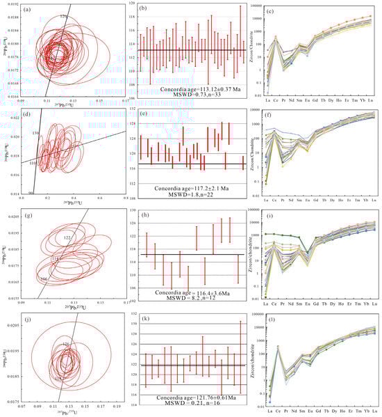 Dating analysis of the 29 zircons from the Xiaozhushan samples yielded 12 concordant data points (>85). The euhedral short-prismatic crystals (120–150 μm, aspect ratio ~5:3) exhibited magmatic oscillatory zoning in CL images (Figure 5b,c), typical of magmatic zircons. U and Th contents ranged from 636 to 3515 × 10−6 and 531 to 2864 × 10−6, respectively, with Th/U ratios of 0.81–1.42 (Table S3), consistent with magmatic origins (Th/U > 0.4). ZrO2 content is high (62.63%–70.57%). Trace elements were low, showing HREE enrichment, pronounced Ce positive anomaly (2.5–174.5), and Eu negative anomaly (0.02–1.1) (Figure 6i) (Tables S4 and S5). The weighted concordia age was 116.4 ± 3.6 Ma (MSWD = 8.2; Figure 6g,h). For the Laoshan sample (LS), 16 concordant data points (>95%) were obtained. The crystals were predominantly short-prismatic to granular (80–150 μm, aspect ratio ~2:1) with subhedral morphology. The CL images show magmatic oscillatory zoning (Figure 5a,g,h), indicative of magmatic zircons. U and Th contents ranged from 148 to 1537 × 10−6 and 184 to 2750 × 10−6, respectively, with Th/U ratios of 1.17–2.9 (Table S3), consistent with magmatic origins (Th/U > 0.4). The weighted concordia age is 121.8 ± 0.6 Ma (MSWD = 0.54; Figure 6j,k) (Tables S4 and S5). The REE patterns are similar to those of the Xiaozhushan zircons (Figure 6l).