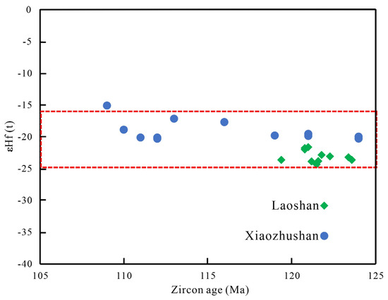 Zircon Hf isotopic analyses provide key constraints on magma sources [46]. In situ Hf isotope analysis was conducted on 12 high-concordance zircon spots from the Xiaozhushan samples (Table S6). The 176Hf/177Hf ratios ranged from 0.00159 to 0.00463, all below 0.002, indicating minimal radiogenic Hf accumulation post-crystallization. Thus, the measured 176Lu/177Hf ratios reflect the values observed during zircon formation. The initial 176Hf/177Hf ratios for the granite porphyry (116.4 ± 3.6 Ma) ranged from 0.2821 to 0.2822 (avg. 0.2821), with εHf(t) values of −15.071 to −20.288 (avg. −19.046; Figure 7). The first-stage (TDM1) and second-stage (TDM2) Hf model ages were 1.44–1.72 Ga and 2.12–2.46 Ga (avg. 2.38 Ga), respectively. For the Laoshan samples, 11 spots were analyzed (Table S6). The 176Hf/177Hf ratios ranged from 0.0017 to 0.0025, also indicating negligible radiogenic Hf accumulation. The initial 176Hf/177Hf ratios for the granites (121.78 ± 0.61 Ma) ranged from 0.28201 to 0.28208 (avg. 0.28205), with εHf(t) values of −21.625 to −24.333 (avg. −23.123; Figure 6), suggesting an ancient crustal magma source. The TDM1 and TDM2 model ages were 1.67–1.79 Ga and 2.53–2.69 Ga (avg. 2.61 Ga), respectively.
