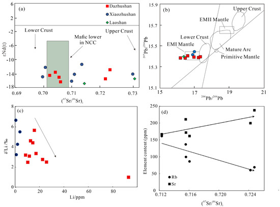 Sr–Nd–Pb–Li isotope test results in the study area: (a) initial Sr–Nd isotopic composition of study area granites; (b) Ph isotopic compositions diagram of study area granites; (c) Li-δ7Li diagram of Zhushan granites; and (d) correlation diagram of Sr–Nd isotopes and elements of study area granite. [The late Paleozoic intrusions in the northern margin of the NCC are referenced from [47] and EMl, EMll, HlMU and Primitive Mantle after [48]; lower crust, mature arc and upper crust after [49]].