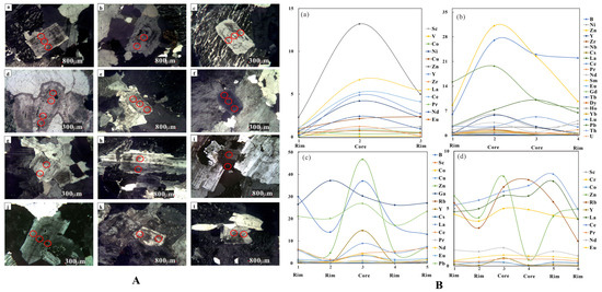 Results of trace element analysis of plagioclase in the research area (A) the location image of feldspar mineral ring in the study area: (a–d) Dazhushan; (e–h) Xiaozhushan; and (i–l) Laoshan. (B) line chart of trace element variation in in situ micro area of study area plagioclase: (a) DZS-1; (b) XZS-1; (c) TL-3; and (d) LS-1.