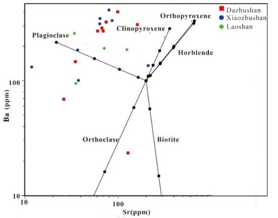 - El Bouseily, A.M.; El Sokkary, A.A. The relation between Rb, Ba and Sr in granitic rocks. Chem. Geol. 1975, 16, 207–219. [Google Scholar] [CrossRef]