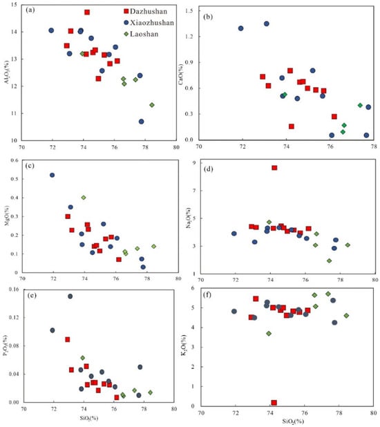 Harker diagram of the high-differentiation granite in the study area. (a) Al2O3-SiO2; (b) CaO-SiO2; (c) MgO-SiO2; (d) Na2O-SiO2; (e) P2O5-SiO2; (f) K2O-SiO2.