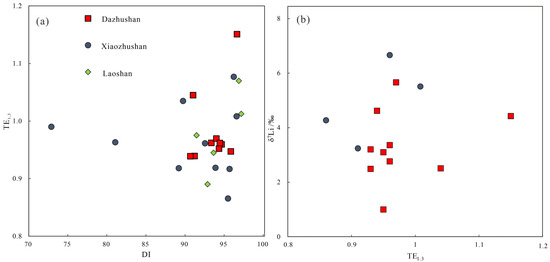 In the Dazhushan granite, samples with TE1,3 = 1.15 show a slight increase in ore-bearing potential with higher DI, consistent with petrographic spodumene observation. The Li2O content reached 0.66%, below the industrial grade of 1.50%, indicating sub-economic Li mineralization. A positive correlation between the REE tetrad effect and Li isotopes (Figure 15b) indicates that the tetrad effect enhances Li isotope enrichment [74], facilitating mineralization. The TE1,3-DI diagram shows that TE1,3 slightly increased with higher DI, reflecting the granite ore-bearing potential (Figure 15a). Zircon in ore-forming rocks exhibits high (Ce/Nd)/Y, δEu > 0.3, 10,000 × (δEu)/Y > 1, and whole-rock 10,000 × (δEu)/Y > 400, serving as indicators of ore-forming potential [74]. Studies have applied Li isotopes directly to granite source areas [75].