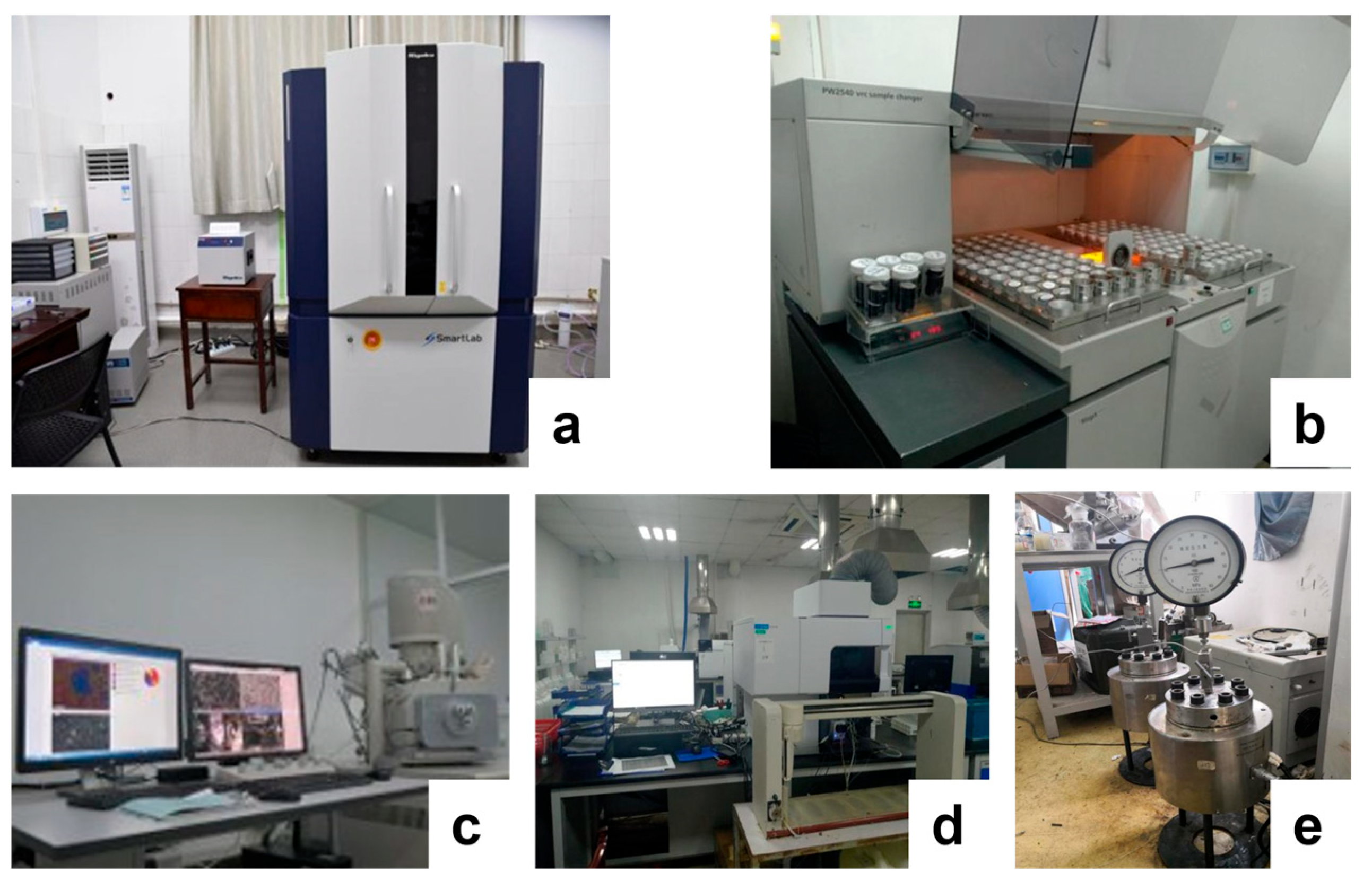 Figure 1. Experiment instruments. (a) XRD, (b) XRF, (c) SEM-EDS, (d) ICP-OES, (e) high-temperature and high-pressure reactor.