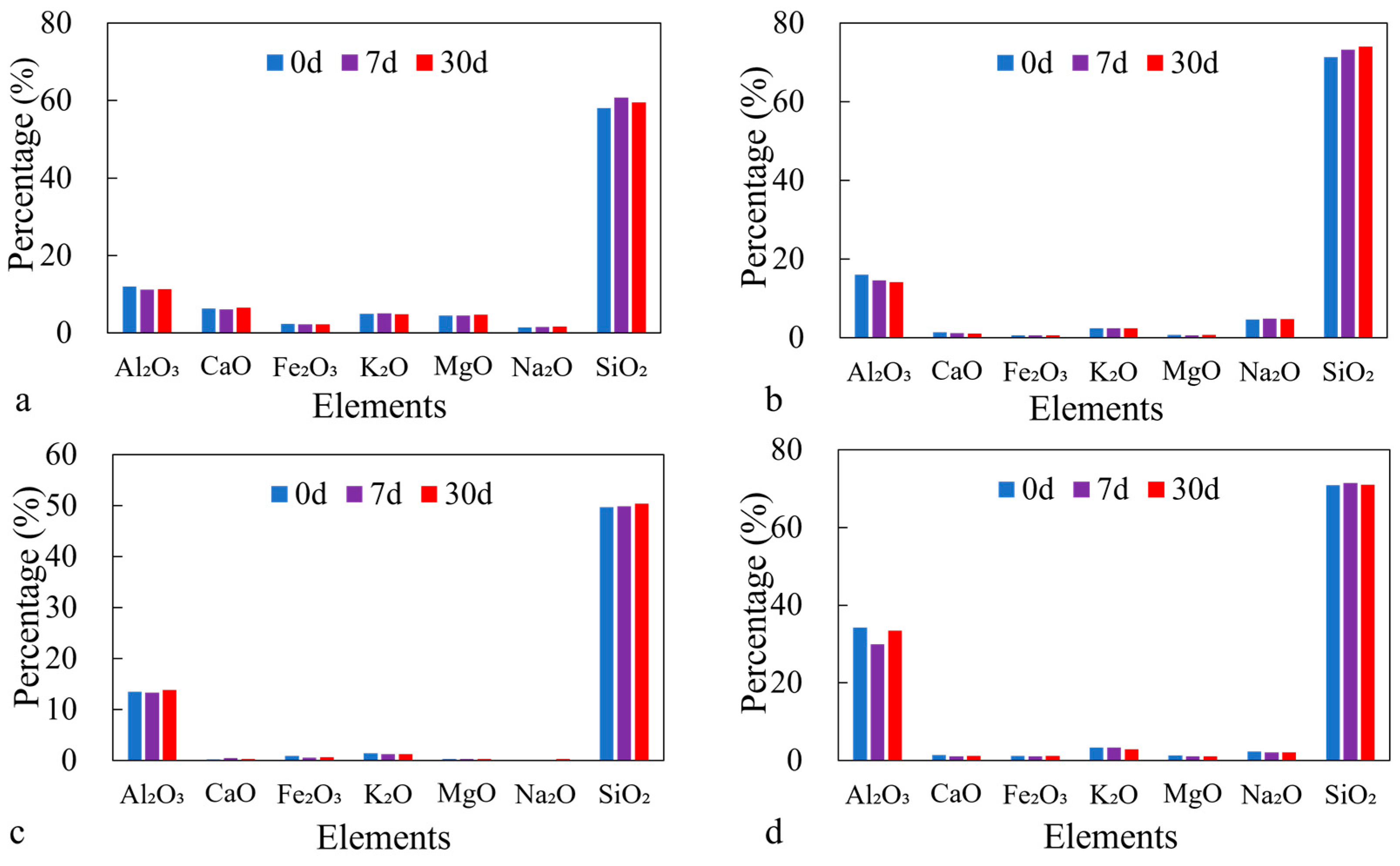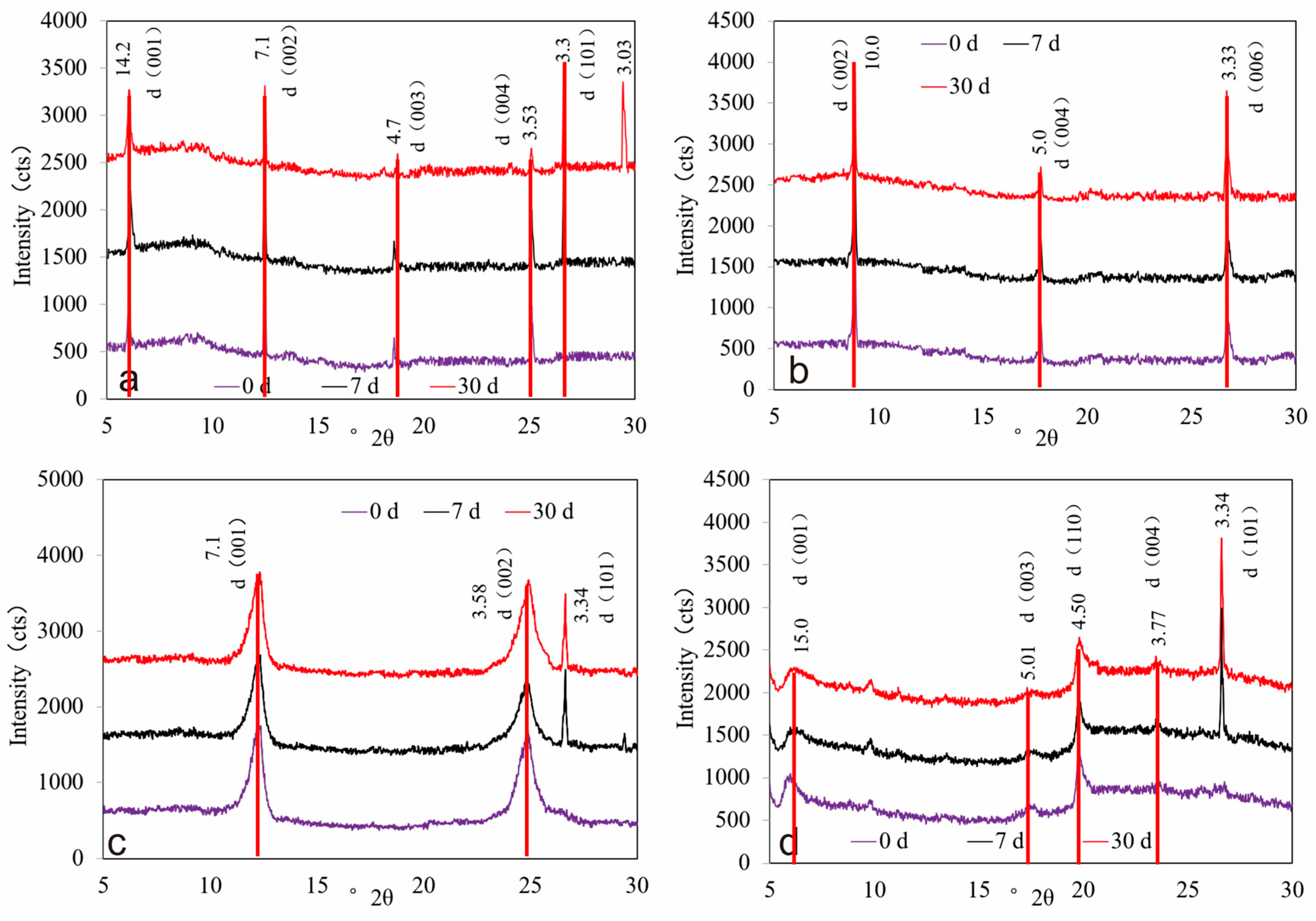 Kaolinite. The crystal structure of kaolinite remained relatively stable over the first 30 days. After 7 days, the d(001) and d(002) peaks decreased by 4.20% and 6.27%, respectively; by 30 days, the decreases were 2.79% and 6.70%. These changes are minor, indicating limited structural damage and no new crystalline phases [16,21]. The quartz peak remained essentially unchanged, suggesting no formation of crystalline SiO2 (Figure 5c).