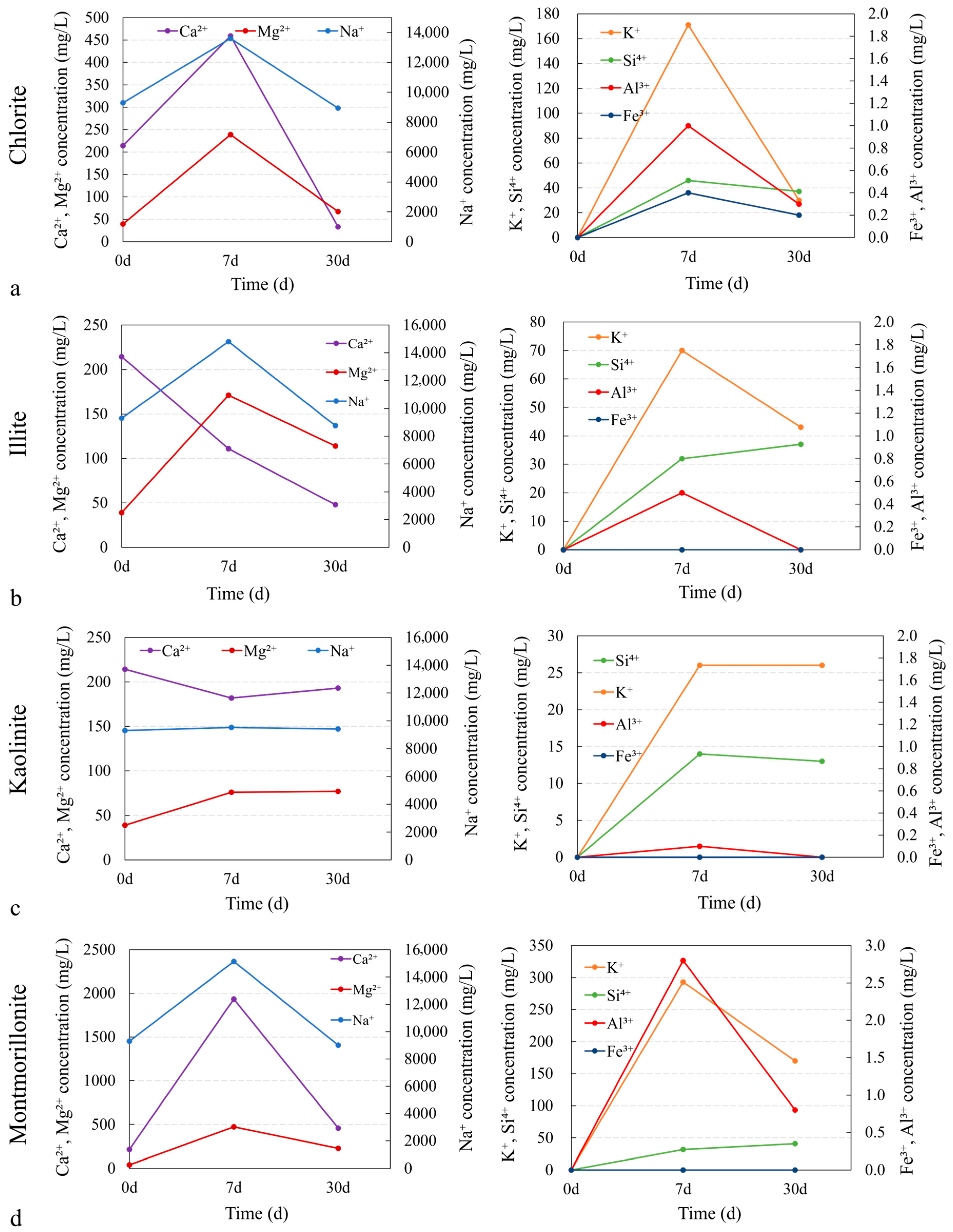 Montmorillonite showed a distinct behavior compared to chlorite and kaolinite, particularly in terms of the rate of ion release and dissolution. In the montmorillonite system, the Ca2+ concentration increased sharply from 214.3 mg/L to 1935 mg/L within the first 7 days, followed by a decline to 459 mg/L between days 7 and 30. Similarly, the Mg2+ concentration rose from 39.1 mg/L to 473.0 mg/L in the first 7 days and then dropped to 228.0 mg/L by day 30. The Al3+ concentration increased from 0 to 2.8 mg/L in the first 7 days, then decreased to 0.8 mg/L by day 30, while the Si4+ concentration rose from 0 to 41 mg/L and then leveled off. This sharp initial increase followed by a decline in ion concentrations suggests a strong initial release of interlayer cations, which is more pronounced than in other clay minerals. The ion release behavior of montmorillonite is likely influenced by cation exchange processes, where the interlayer cations are exchanged with the surrounding aqueous phase, leading to the observed mobilization of ions. In contrast, while other clays also show a rise in ion concentrations initially, montmorillonite’s sharp early-stage release is more significant. The decreasing trend of K, Ca, and Mg concentrations in montmorillonite indicates that the interlayer cations were gradually released and mobilized during the reaction, highlighting the distinct ion release behavior of montmorillonite compared to other clays (Figure 8d).