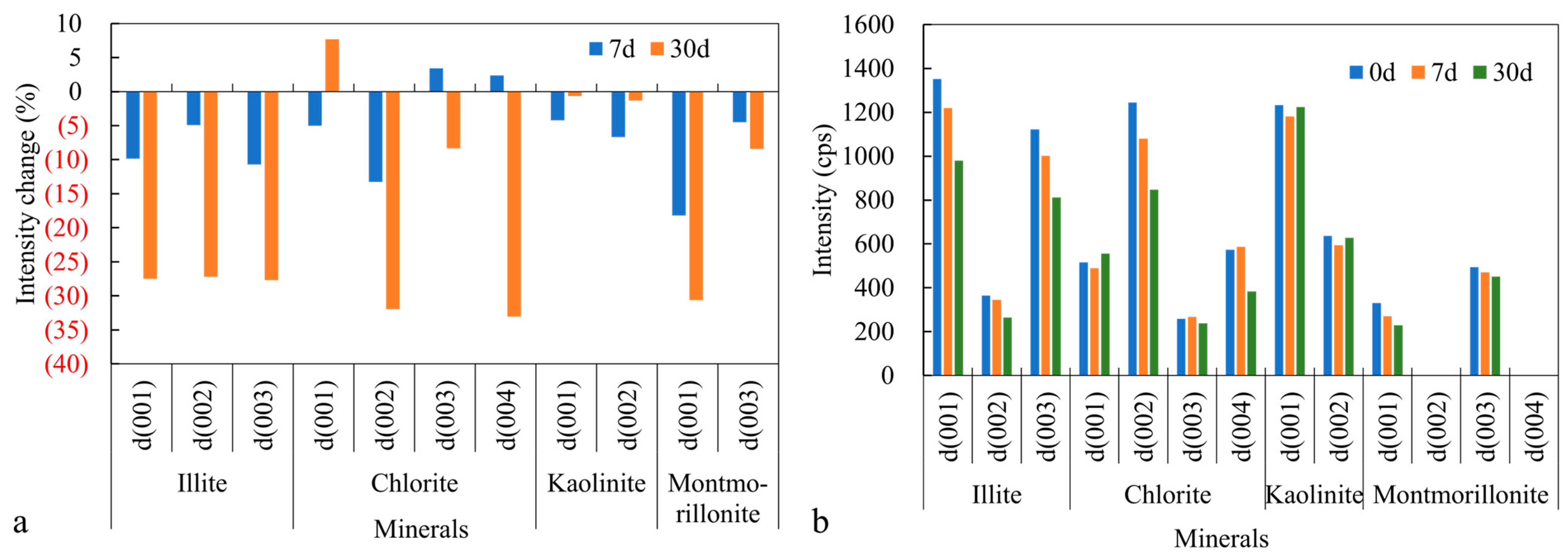 Illite. No obvious structural damage was detected after 7 days. By 30 days, the d(002), d(004), and d(006) peaks showed a gradual attenuation of 16.6–22.5%, indicating moderate damage to the illite structure after prolonged exposure, possibly due to the interaction of water within the structure with CO2, resulting in the formation of carbonic acid (H2CO3) [16,20]. The presence of carbonic acid may have contributed to the dissolution of K-feldspar and chlorite, as evidenced by changes in their XRD peaks, without the formation of new crystalline phases (Figure 5b).
