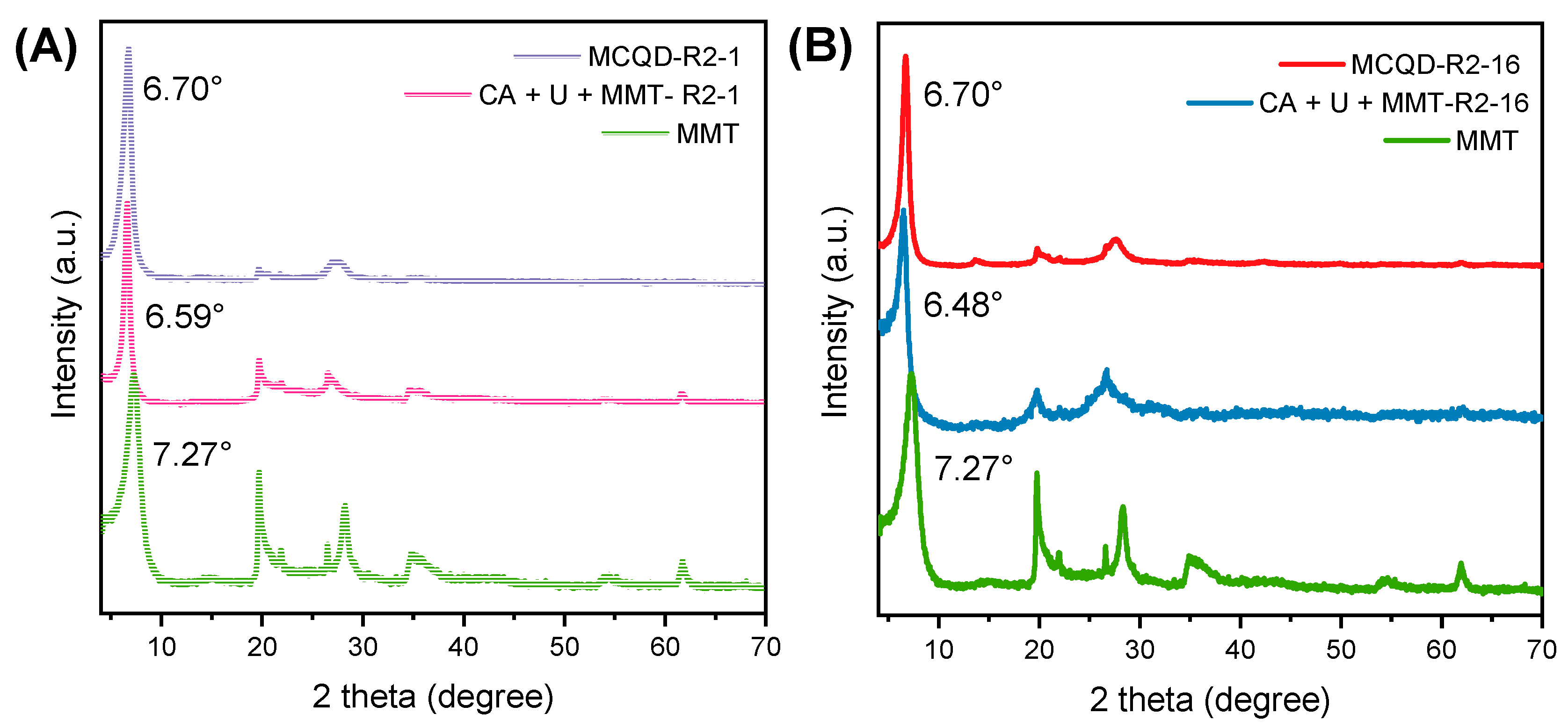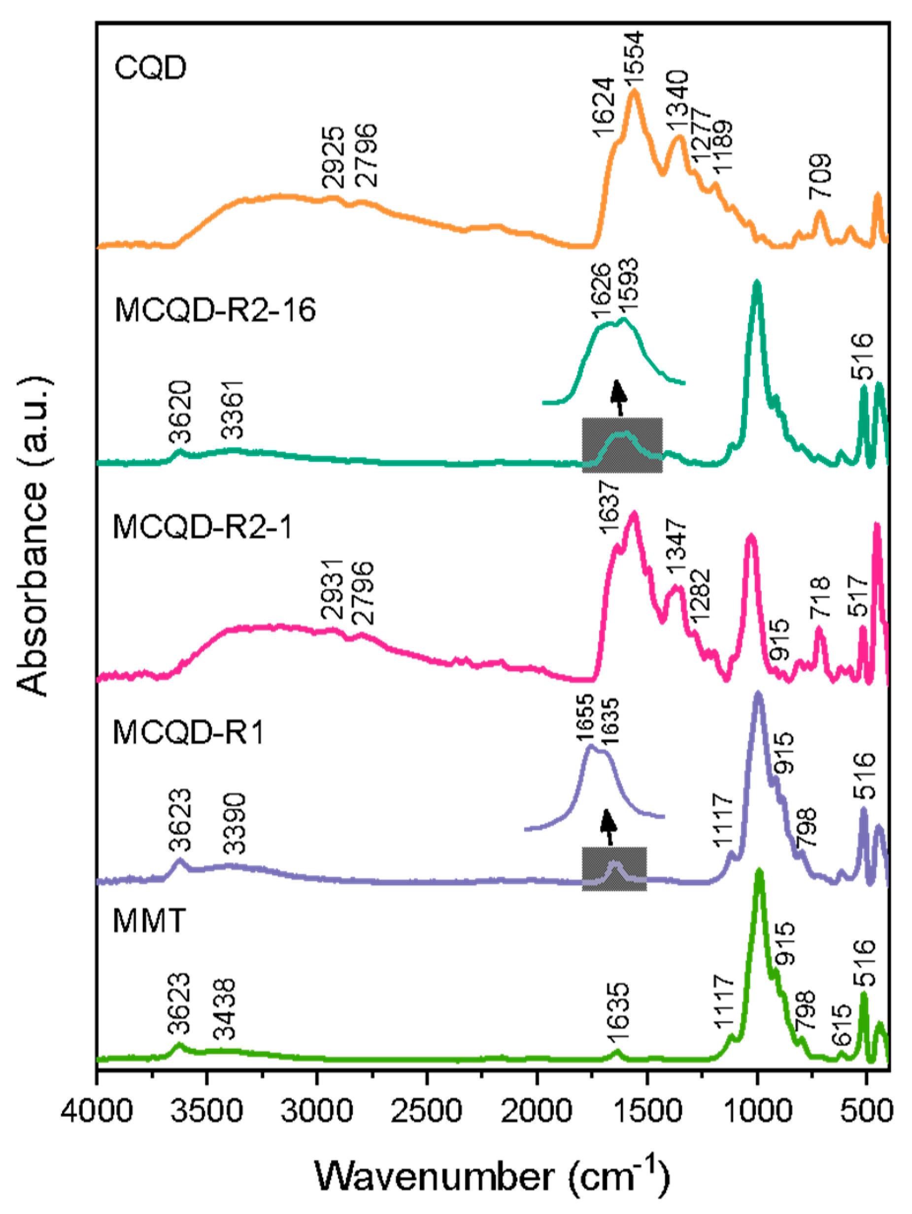 2.3. Preparation of Montmorillonite–Carbon Quantum Dots Hybrid Nanomaterials