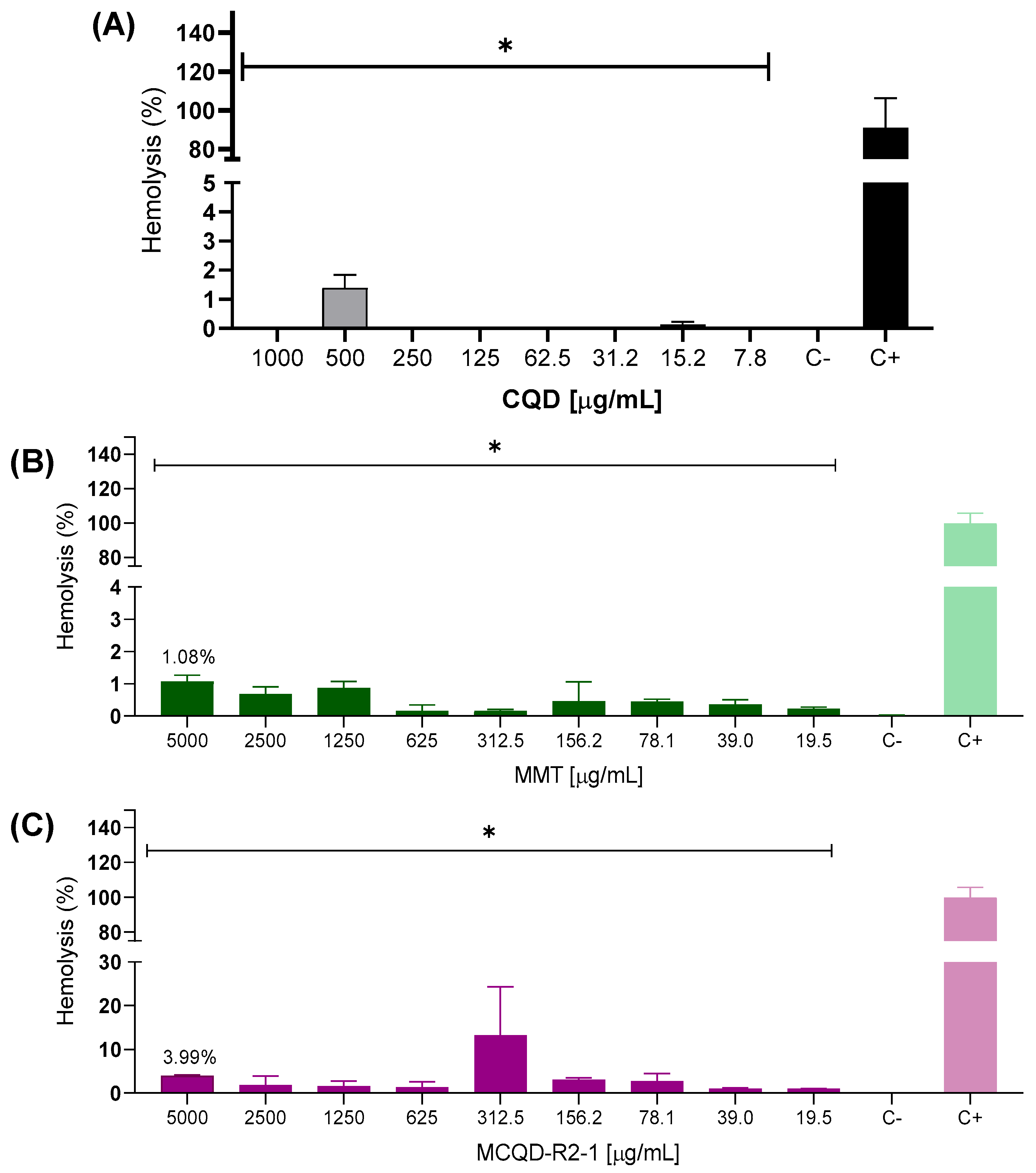 2.5. Hemolysis Test with Sheep Erythrocytes
