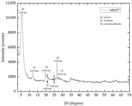 Analyzing the diffraction patterns of MMTCa, Figure 1, it is possible to observe the presence of the phases montmorillonite (M), kaolinite (K), and quartz (Q). The characteristic peaks of MMT are identified as follows: the peak at 2θ = 5.54°, associated to the basal plane spacing (d001) of 1.59 nm, and the peaks at 2θ = 19.83° and 27.48. The kaolinite peak at 2θ = 12.31° is associated to d(001) = 0.72 nm, and the quartz peak observed at 2θ = 26.62° may be associated to d(001) = 0.33 nm [66,67].