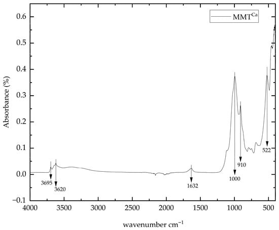 Figure 2 shows the FTIR spectrum of as-received natural MMTCa. The characteristic bands of O–H stretching vibration bands were observed in the range of 3695 to 3620 cm−1, originating from OH groups coordinated to various octahedral cations, primarily Al2OH, Al-Mg-OH, or Al-Fe-OH [23]. The deformation vibration band of montmorillonite’s interlayer water was observed at 1632 cm−1 [68]. The strongest absorption band, characteristic of clay minerals and corresponding to Si–O stretching vibration, was observed at 1000 cm−1 [69]. Finally, bending vibrations of Al2OH and Al–OH can be observed at 910 and 522 cm−1, respectively [70].
