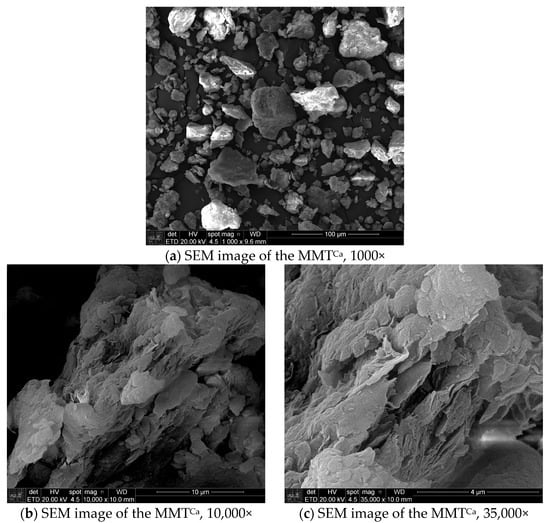 Scanning electron microscopy (SEM) images of the as-received natural MMTCa were acquired using an Everhart–Thornley (ETD) detector to collect secondary electrons (SE). These images, obtained at magnifications of 1000, 10,000, and 35,000 times, are presented in Figure 3a–c. It is possible to observe their typical lamellar structure, with agglomerates of small size clay particles (5 to 60 µm), and the typical irregular forms as “corn flakes” [13,18]. Table 4 presents the semi-quantitative chemical analysis of the as-received natural MMTCa acquired by energy-dispersive X-ray spectroscopy (EDS) (full area Figure 3a). Based on the MMT theoretical formula IV(Si4) VI(Al2−y Mgy) O10 (OH)2, yM+.nH2O [71], and the result from semi-quantitative chemical analysis obtained by EDS, it is possible to identify the sample as montmorillonite. The elemental composition, predominantly silicon, aluminum, and iron, is consistent with this classification. The presence of magnesium, calcium, and potassium further suggests isomorphic substitutions in both the tetrahedral and octahedral sheets, a characteristic feature of MMT. Titanium was also identified as an impurity. These findings align with Brazilian montmorillonite [9].