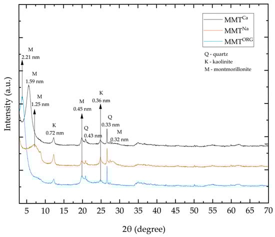 XRD patterns of MMTCa, MMTNa, and MMTORG.