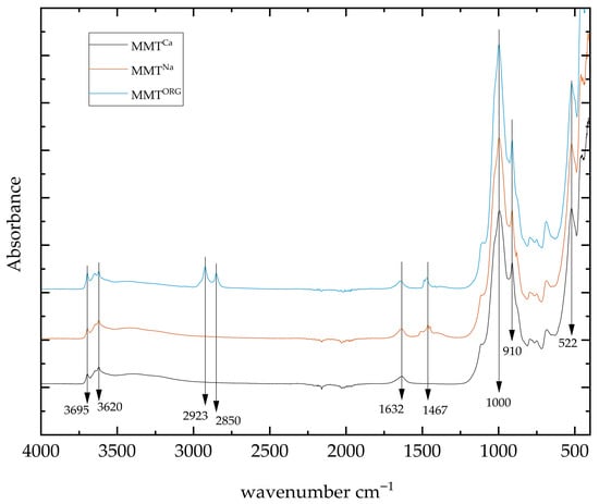 FTIR spectra of MMTCa, MMTNa, and MMTORG.