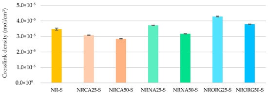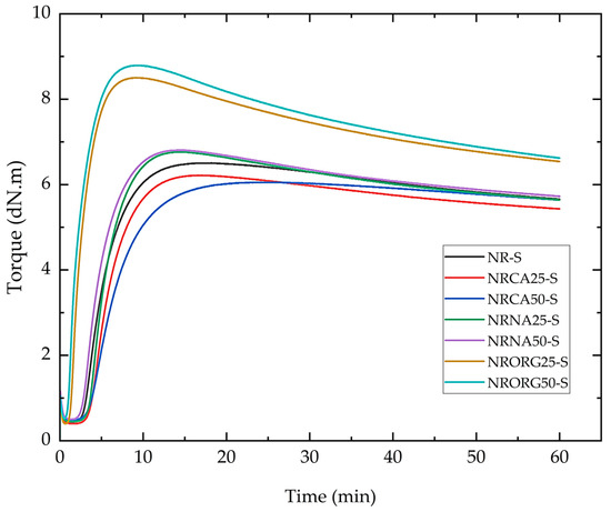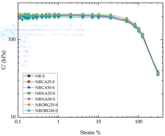 Rheology and mechanical tests on natural rubber compounds and nanocomposites were conducted. The vulcanization profiles were determined using an oscillatory disc rheometer (Rubber Process Analyzer—RPA, model Elite, TA Instruments Inc., New Castle, DE, EUA). Measurements were conducted at 150 °C for 60 min, following the ASTM D2084 standard [57]. To evaluate the Payne effect, based on the ASTM D8059 standard [58], strain sweep analysis of unvulcanized NR compounds was performed using an RPA Elite (TA Instruments), angular strains ranging from 0.1% to 70% at 60 °C and a constant frequency of 1.7 Hz, with data acquired at three points per decade. The crosslink density was quantified via swelling tests, based on ASTM D2765 standard [59]. Initially, specimens were weighed and then immersed in toluene for 72 h. Post-immersion, the specimens were reweighed before being placed in an oven at 60 °C for an additional 72 h. Following oven drying, a final weight measurement was recorded. The resultant data were subsequently employed in the Flory–Rehner equation to calculate the crosslink density [60].