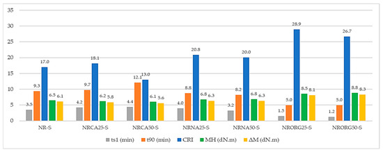 The rubber compounds were vulcanized into 2 mm thick plates utilizing a hydraulic press, SIRMA Public Limited Company Machinery Industry and Trade (Boituva, SP, Brazil) operating at 150 °C. This temperature was selected based on the empirically determined optimal vulcanization time (t90). Subsequently, test specimens for mechanical characterization were prepared from these vulcanized plates. The nomenclature and detailed composition are presented in Table 1.